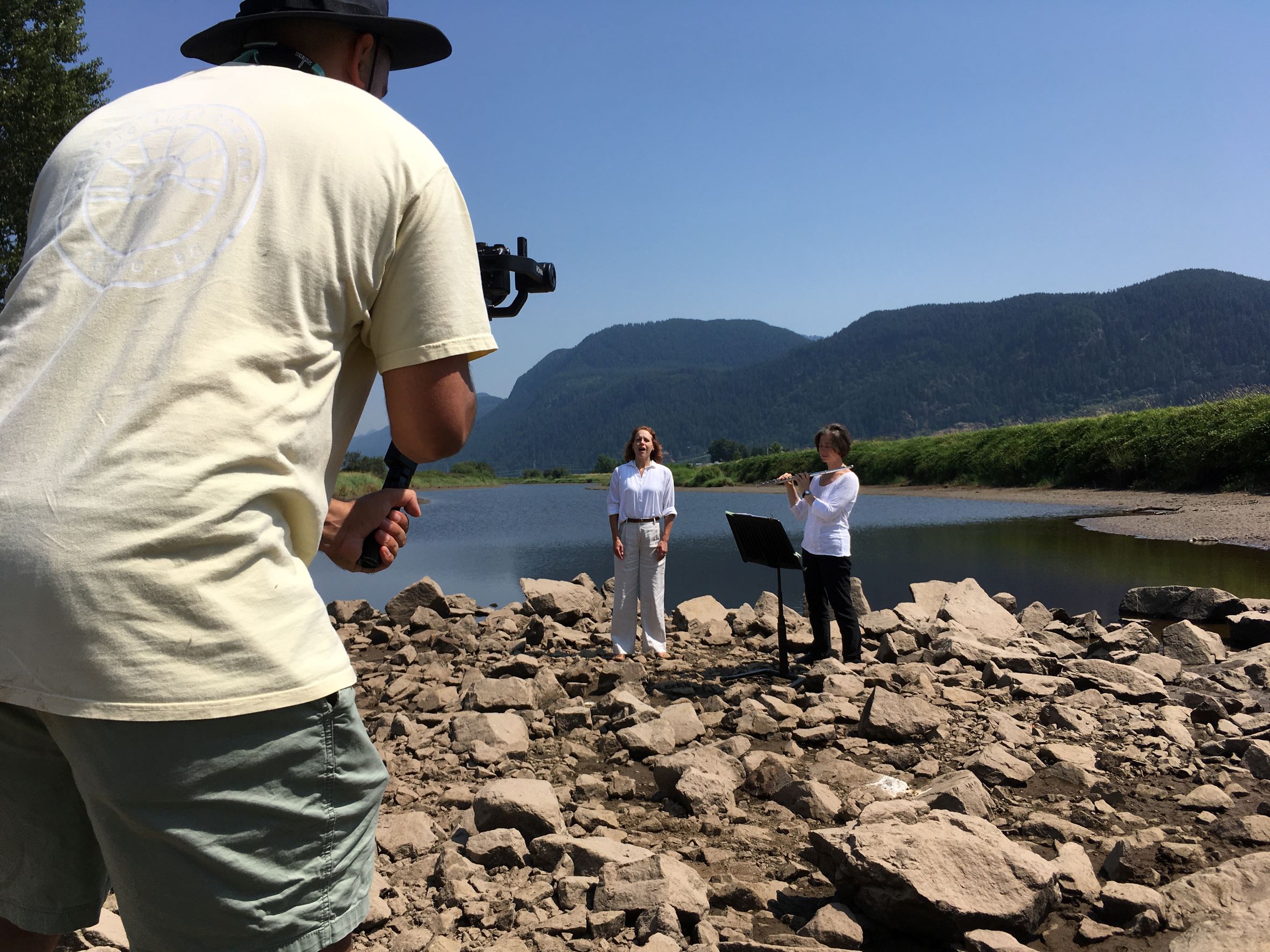 Some behind the scenes photos with from our 1+1+1… film shoot of the piece Loons filmed in July at Pitt Lake. This piece features Brenda Fedoruk on flute and soprano Robyn Klassen.